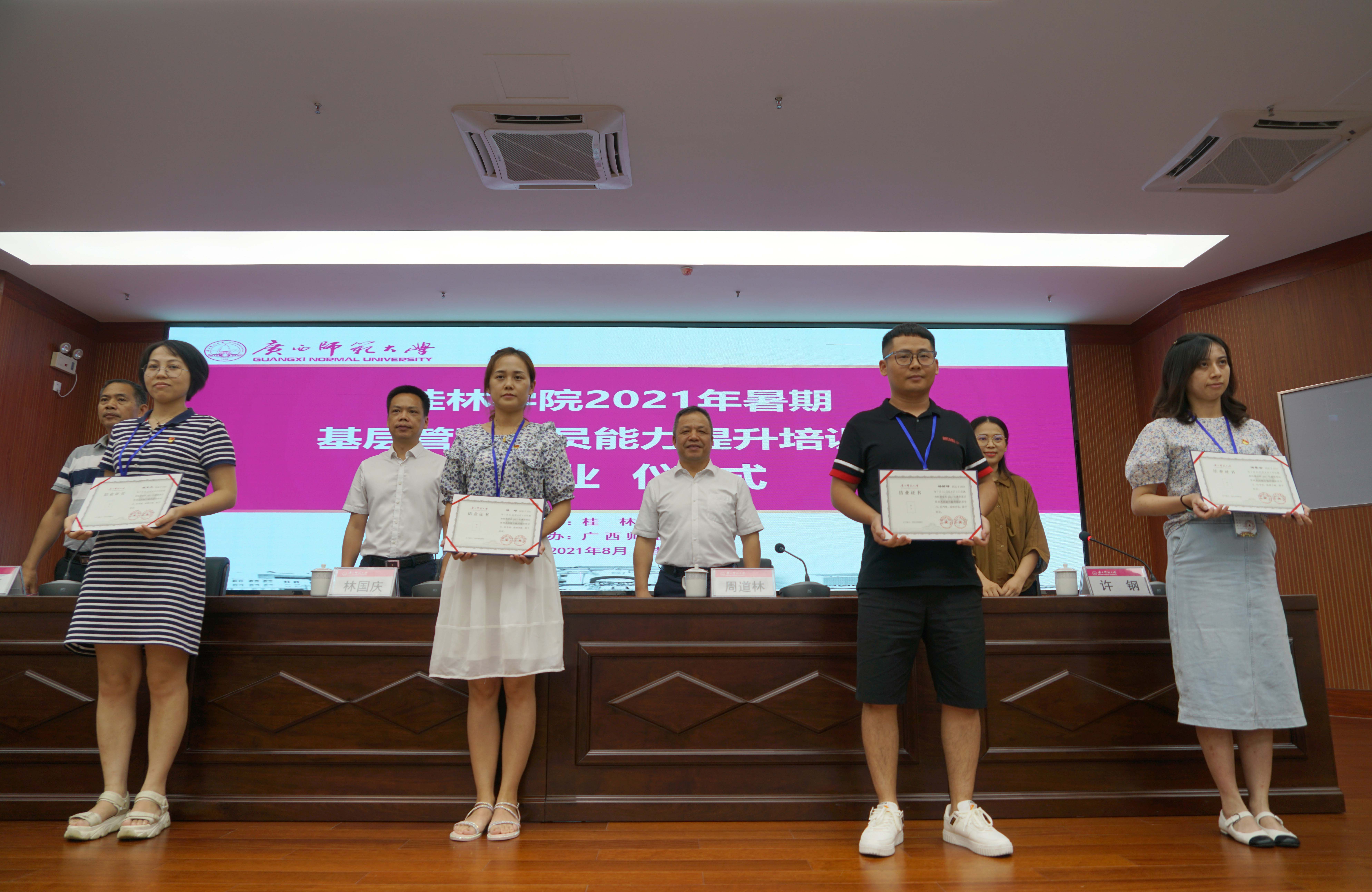 會上,與會領(lǐng)導(dǎo)為學(xué)員代表頒發(fā)了結(jié)業(yè)證書,學(xué)員們表示會以此為契機,把這次理論學(xué)習(xí)結(jié)合到自己的實際工作中,促進各項工作的落實與開展,不斷拓展發(fā)展空間,壯大發(fā)展實力,推動桂林學(xué)院持續(xù)健康的發(fā)展。