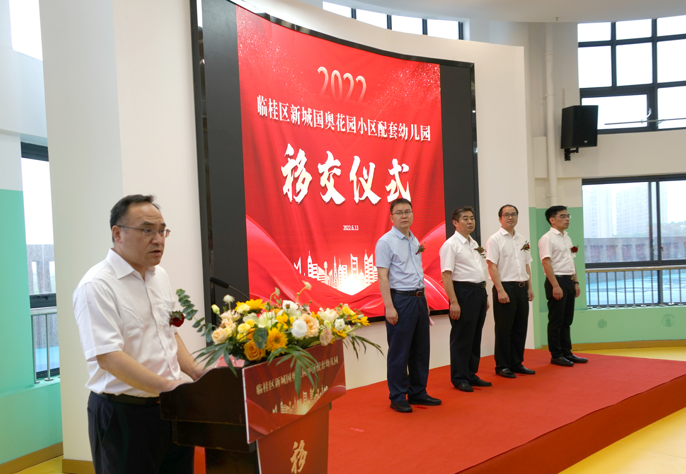 2022年6月13日,桂林市臨桂區(qū)新城國奧花園小區(qū)配套幼兒園交接儀式在幼兒園室內(nèi)小禮堂舉行。市機關(guān)事務(wù)管理局黨組書記、二級巡視員吳殷丹,市機關(guān)事務(wù)管理局局長戴波,臨桂新區(qū)黨工委委員、管委會常務(wù)副主任李星明,臨桂區(qū)常務(wù)副區(qū)長周波,新城投集團黨總支副書記、總經(jīng)理黃峻出席交接儀式?;顒佑膳R桂區(qū)蔣東兵副區(qū)長主持。
