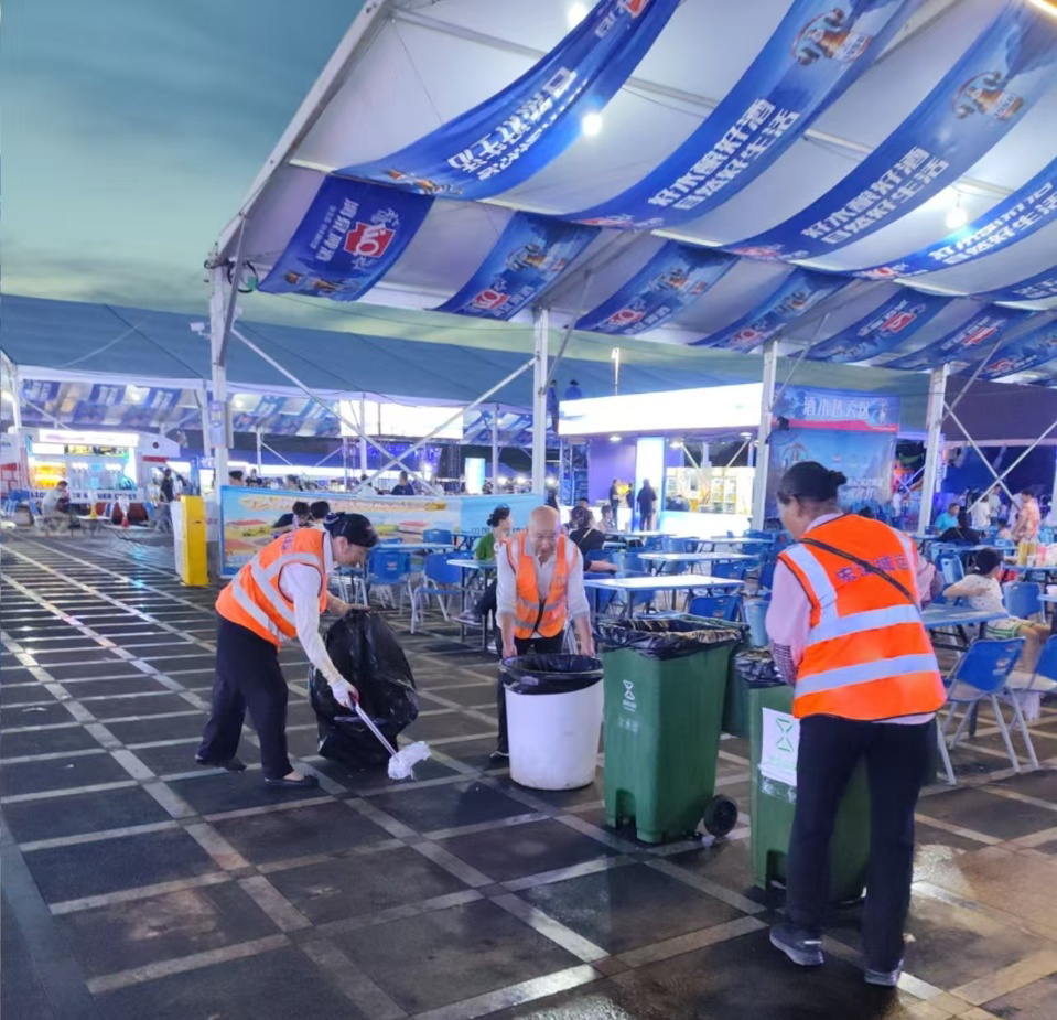 垃圾清運(yùn):13天累計(jì)清理垃圾約2600袋(日均200袋),餐飲垃圾定點(diǎn)清運(yùn),煙花秀廢棄物散場(chǎng)1小時(shí)內(nèi)清理,無(wú)堆積滯留。
