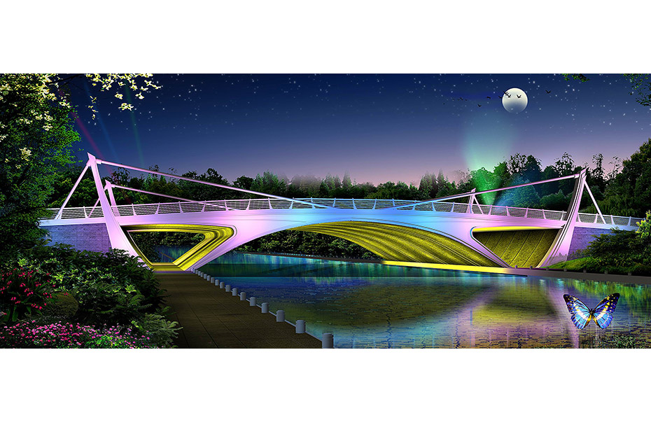 新龍橋由上海市政交通設計研究院有限公司設計,于2016年10月30日開工建設。橋梁為鋼筋混凝土斜腿鋼構,橋臺采用鋼筋混凝土結構,橋身橫跨核心區(qū)水系沙溏河,長56米,寬47米,橋下的景觀游船河道42米,是連接新、老城區(qū)的重要樞紐橋梁
